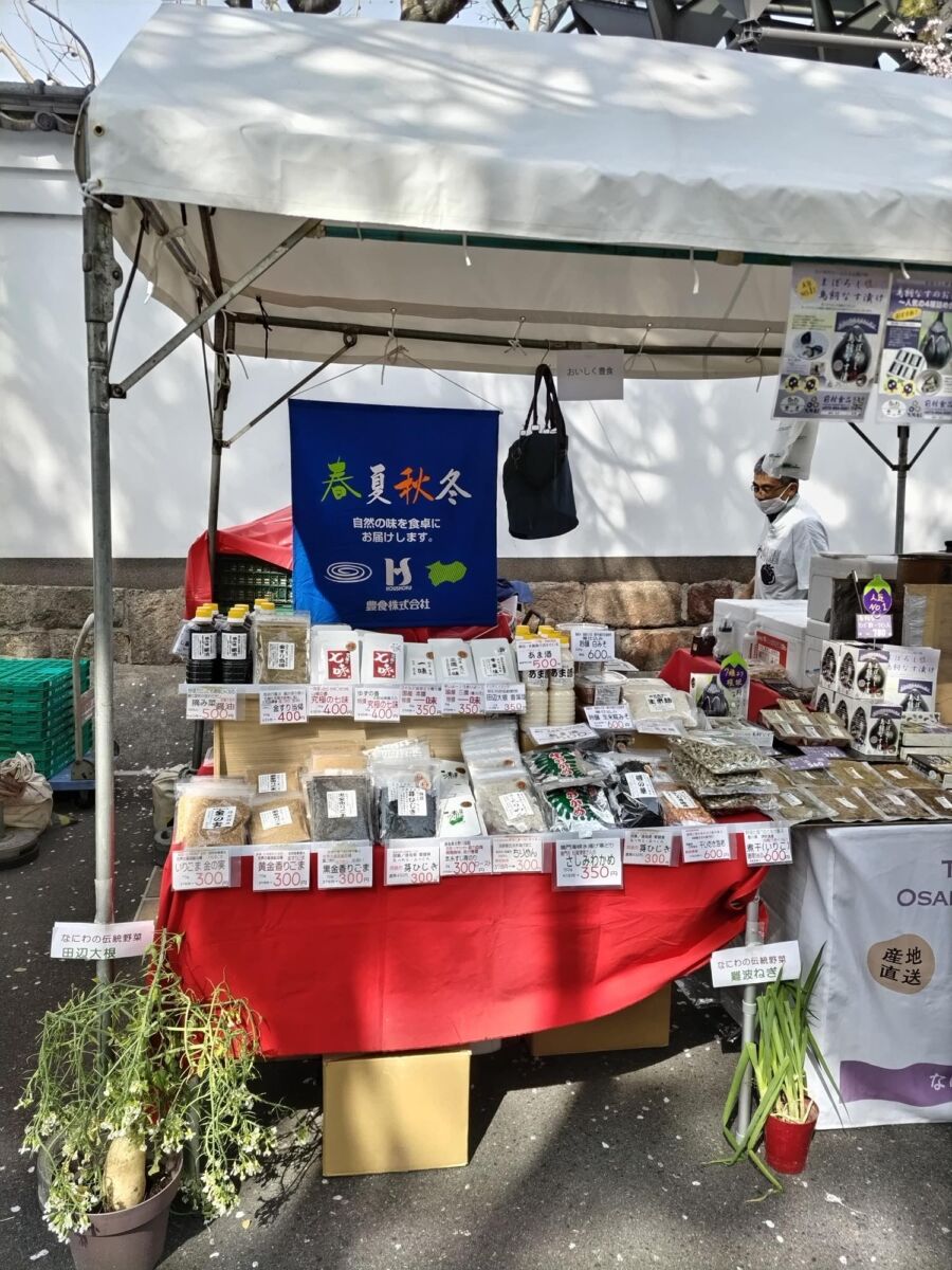 なにわの伝統野菜「鳥飼茄子」の漬物、鳥飼茄子肉まんとチマキの蒸し上げ販売。生米糀あま酒試飲、金ごまと田辺大根葉の無塩ふりかけ、伝統野菜の唐辛子、煮干など、食材調味料販売。